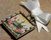 the PENDANTstudio on Etsy... I have actually stumbled across this Etsy shop by Aimee before, and have been swept away by intrigue when having a good browse through her unique jewelry fo the fact that she encases her pendants in a silver frame of solder. I have only tried soldering once before to repair a fiberoptic toy that my son managed to destroy during a local festival some years back, and could I do it? No way! It takes some skill to solder with a steady hand, let alone being able to make these amazingly straight lines that Aimee (who describes herself as a perfectionist) is able to with her frames. I have to say I was very impressed when I first saw her shop and I am more so now, as some of the pieces contain more than just images and could easily be described as wearable pieces of art! The material she uses is lead free and contains 4.9 % sterling silver along with tin and copper, and I love the fact that she does take the framed pendants a step further by including little gems and charms behind the glass with the images, and one of my favourites has to be one of her inclusions in the shop known as "Love Song" which has been featured in Great Finds on madeformebyoaklie. Not restricted to Soldered pendants, you can also find pandora style custom charms, keychains, magnets, gift tags and personalized items and Aimee also offers to do bespoke pieces if you get in touch with her and let her know what sort of ideas you may have for a piece. Have a nosey through my mosaic below and make sure you take a visit to Aimee's shop. You will love it!